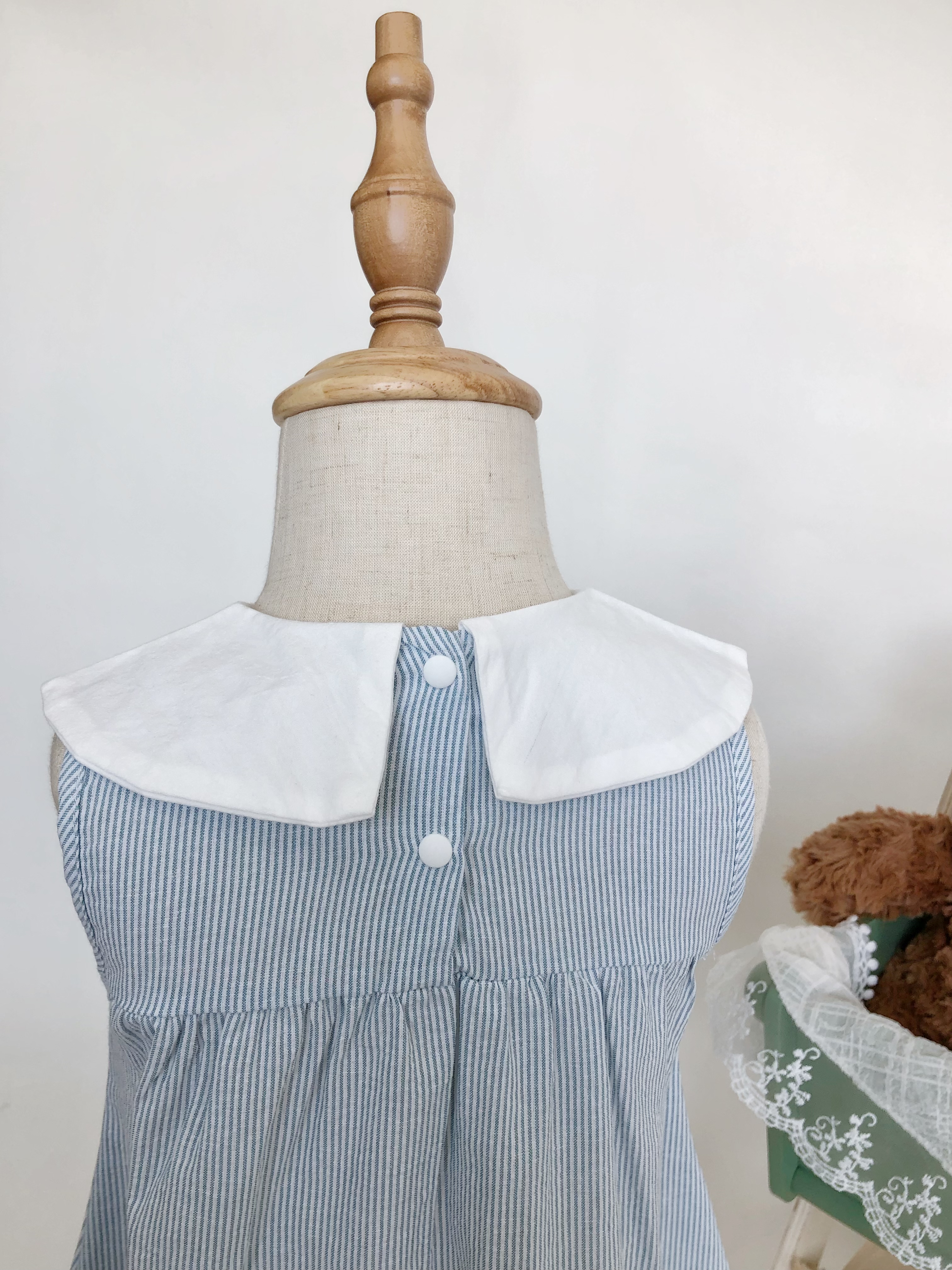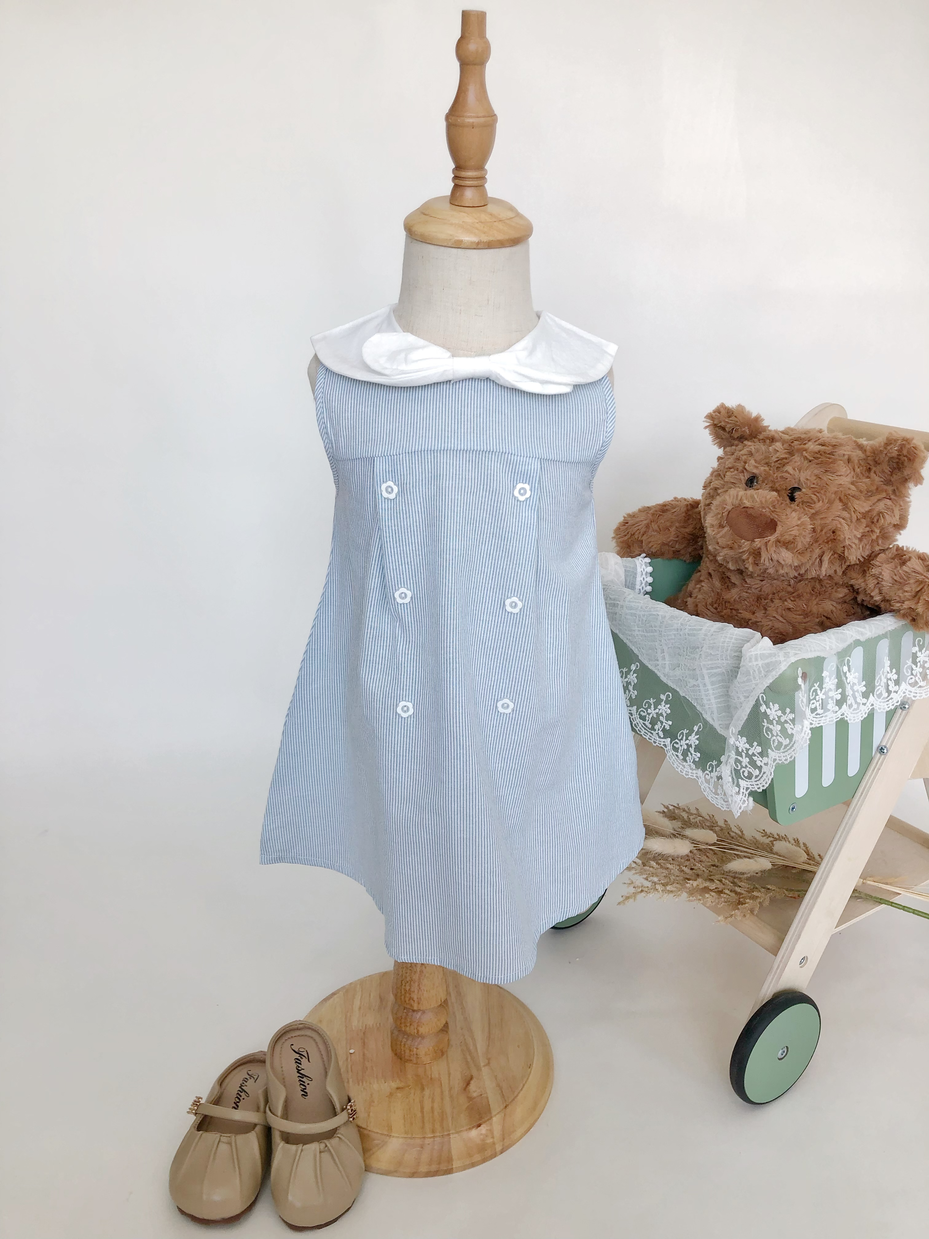 Girl's Blue and White Striped Dress with Ribbon Collar
