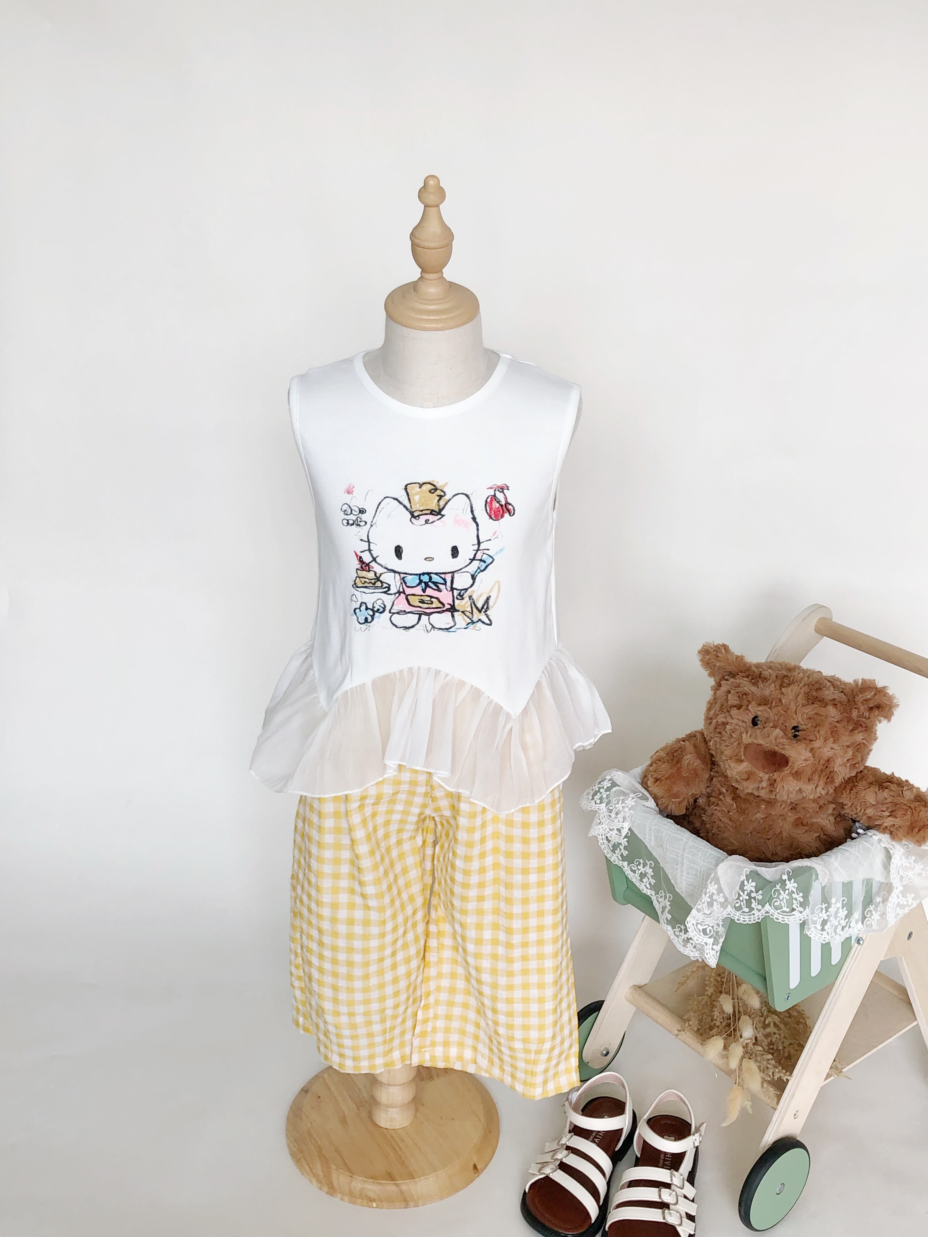 Girls' Sleeveless White Ruffle Tee with Hello Kitty Design and Yellow Gingham Shorts
