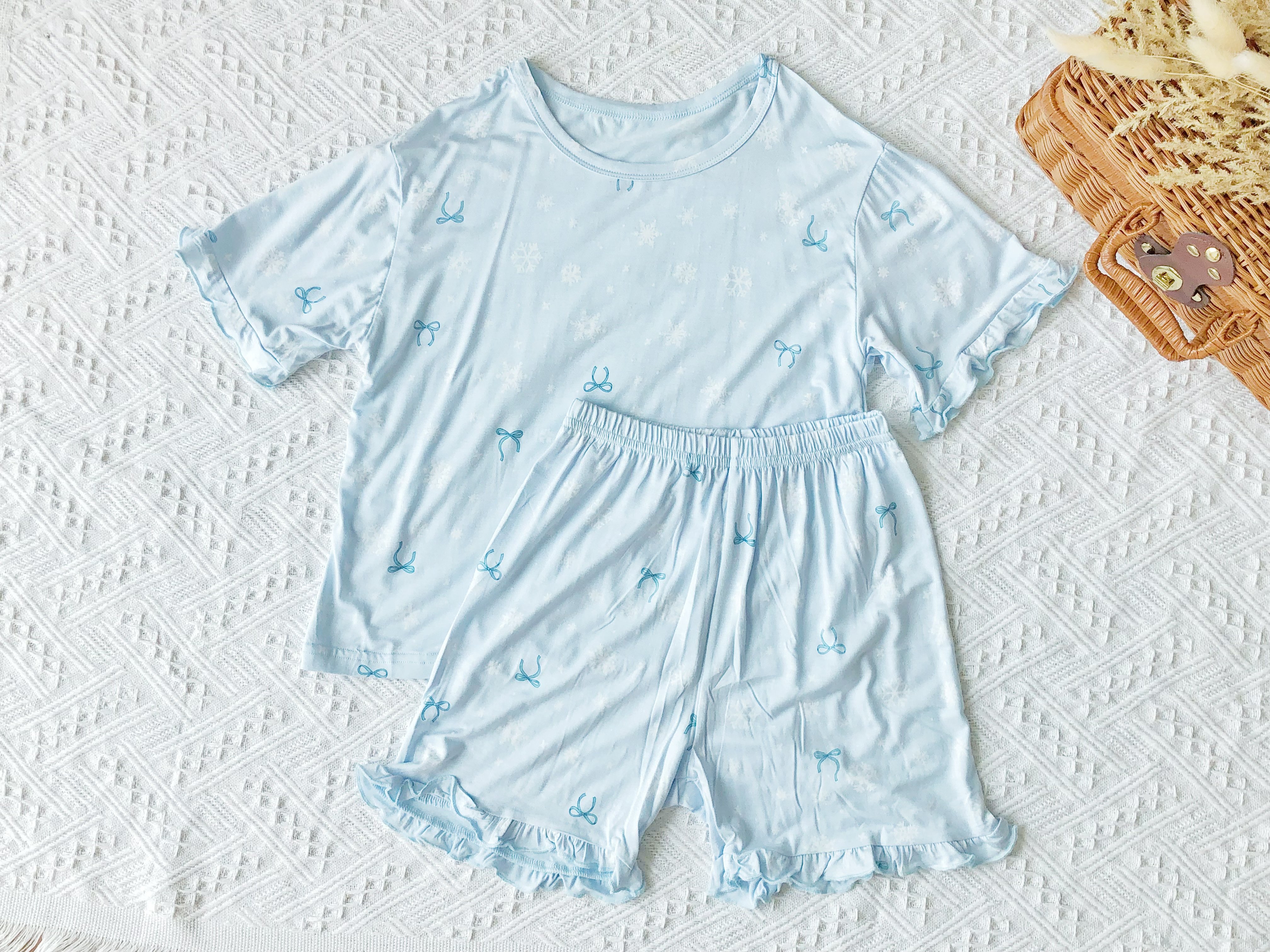 Light Blue Snowflake and Bow Pajama Set with Ruffled Edges