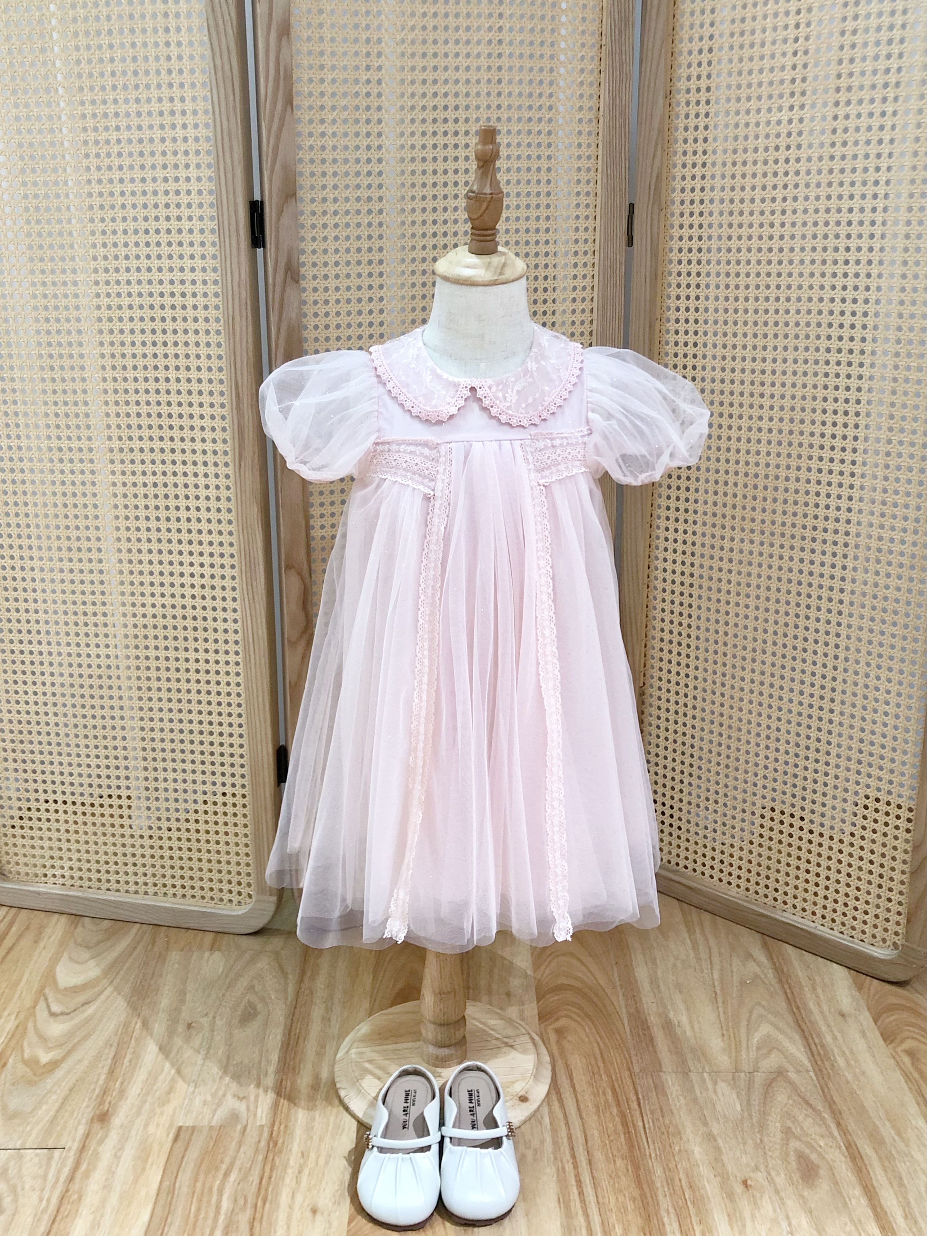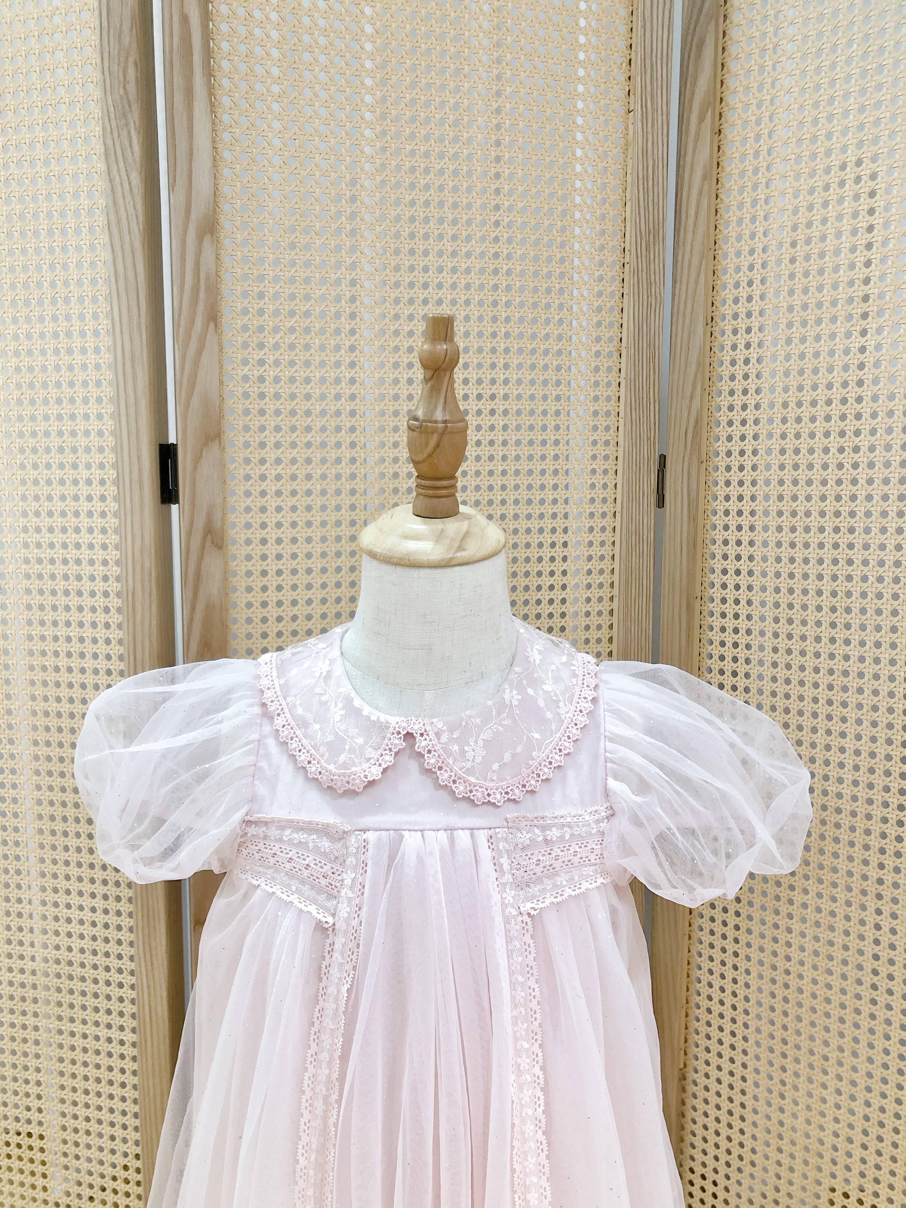 Pink Tulle Dress with Peter Pan Collar and Puff Sleeves