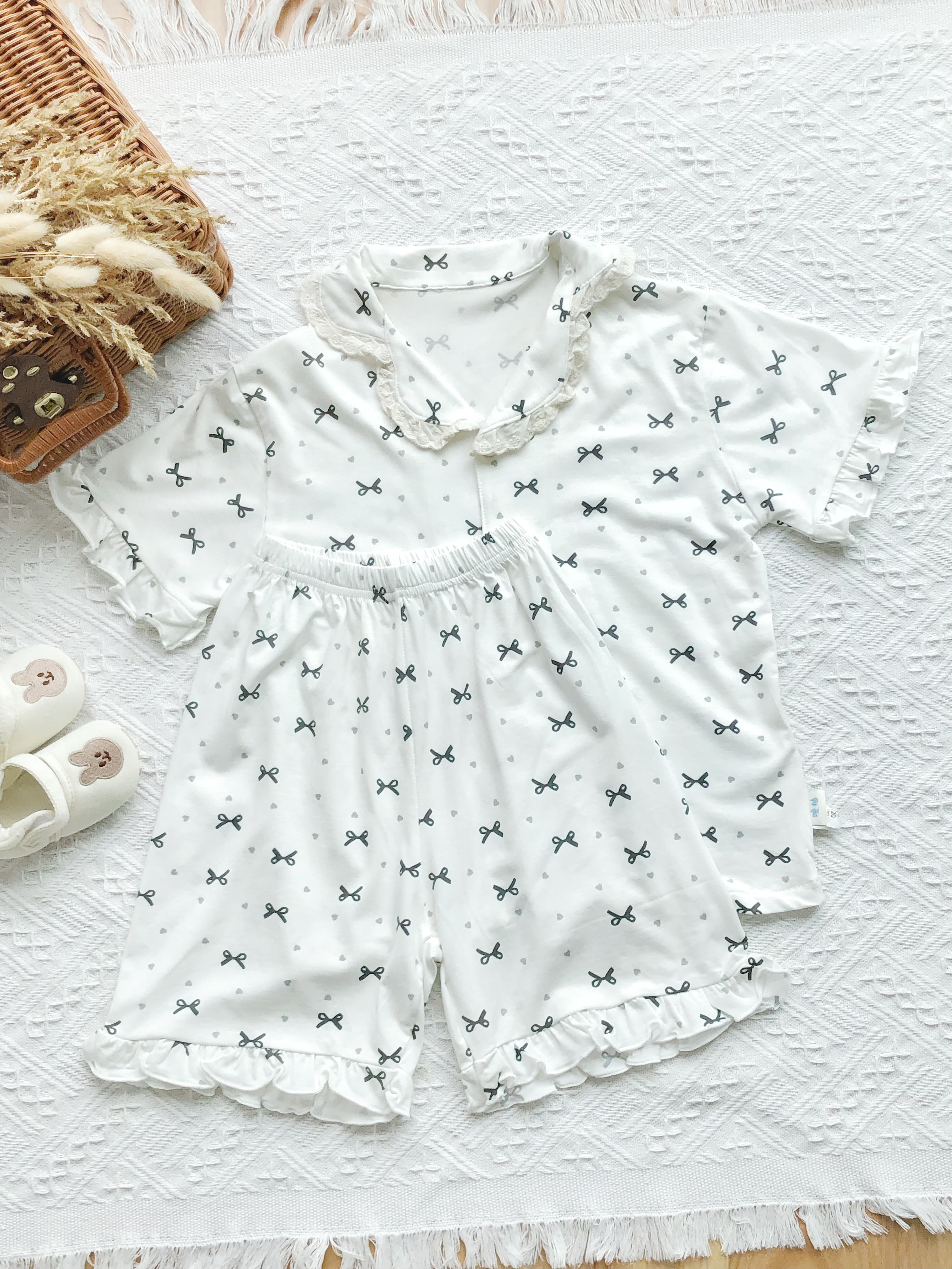 Ribbon Print Lace-trimmed Short-sleeved Lougewear Set