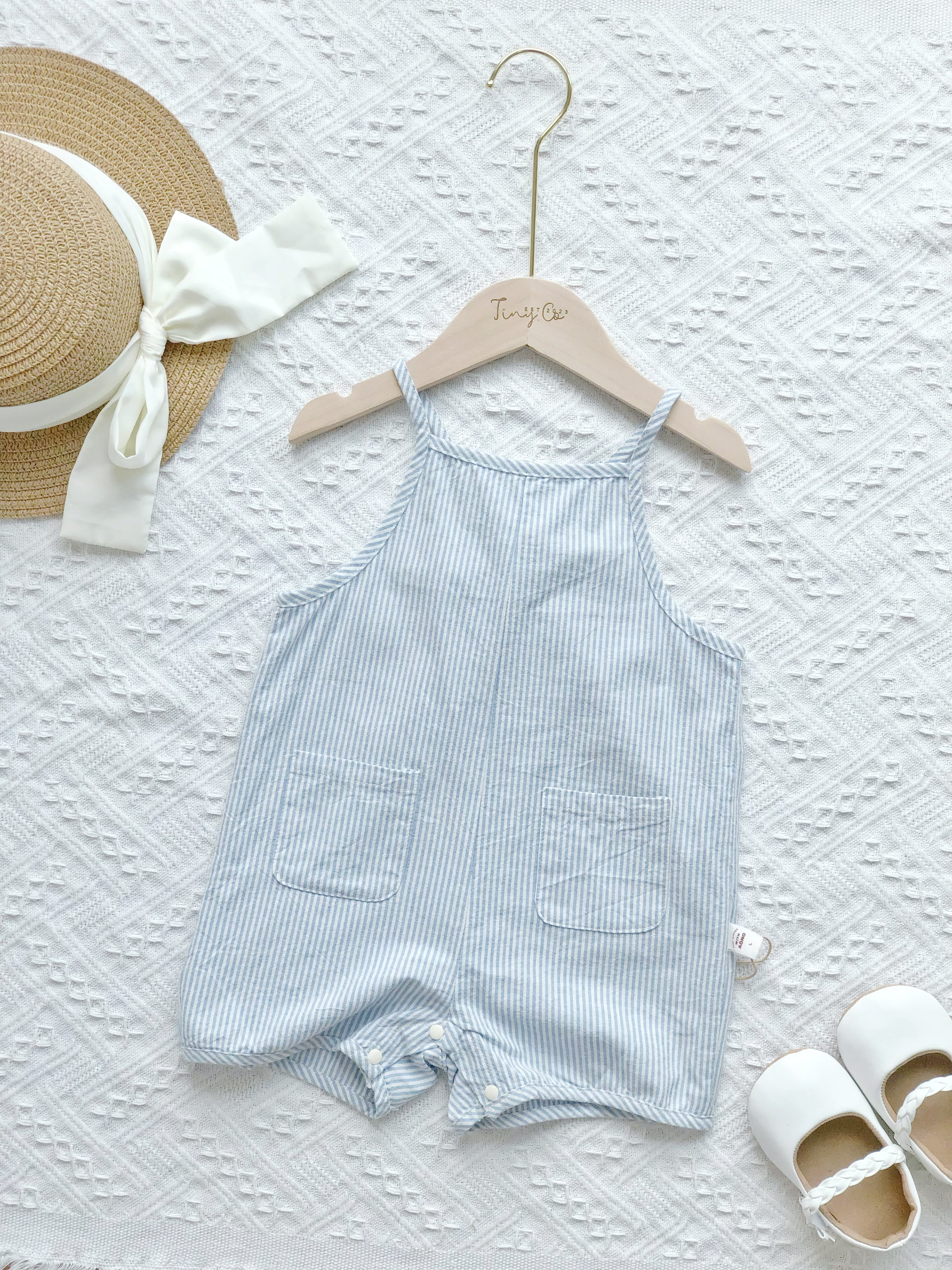 Blue Striped Baby Boy Overall Romper with Embroidered Dog Design