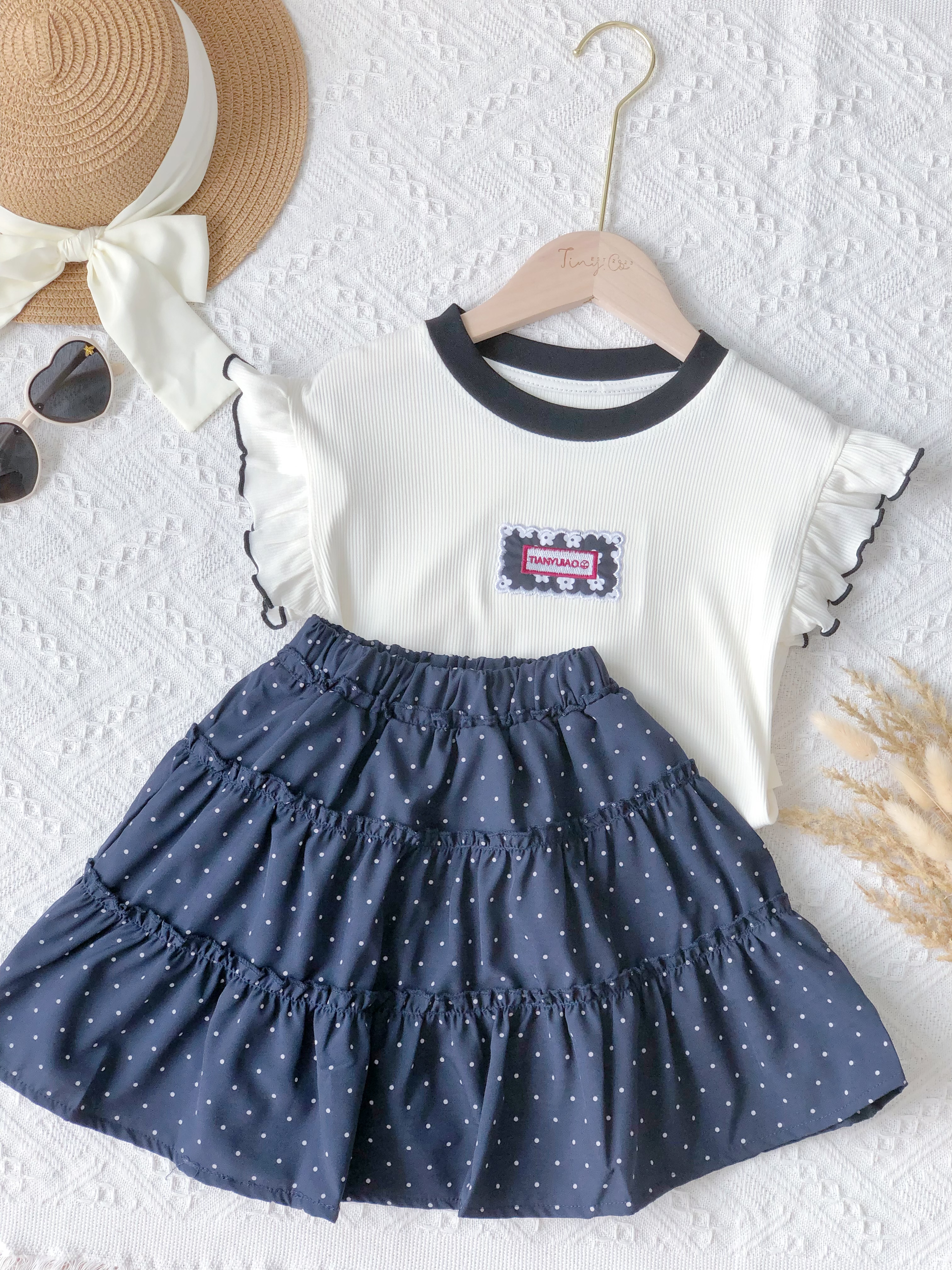 Cute Girl's Ruffle Sleeve Top and Polka Dot Skirt Outfit